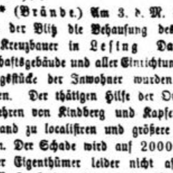 „Am 3. d. M. Nachmittags entzündete der Blitz die Behausung des Franz Görgl vulgo Kreuzbauer in Lesing. Das Haus sammt Wirtschaftsgebäude und aller Einrichtung und sämmtliche Kleidungsstücke der Inwohner wurden ein Raub der Flammen. Der thätigen Hilfe der Ortsbewohner und Feuerwehren von Kindberg und Kapfenberg gelang es, den Brand zu localisiren und größere Unglücksfälle zu verhüten. Der Schade wird auf 2.000 fl. geschätzt und war der Eigenthümer leider nicht assecurirt.“