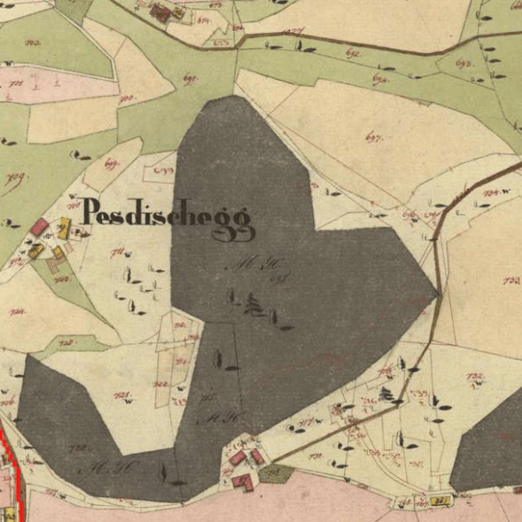 Ein Blick in den Franziszeiischen Kataster zeigt sogar, dass es in Jakobski Dol 1824 einen Hof gab, der „Pesdischegg“ genannt wurde. Dieser Hof existiert sogar heute noch.