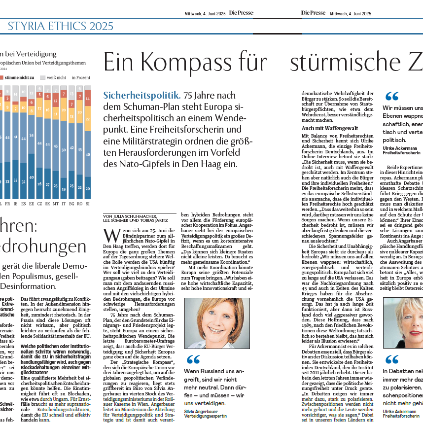 Im Zuge von STYRIA Ethics durfte ich 2025 zusammen mit zwei Studienkolleg:innen eine Doppelseite in der Presse gestalten. Mit vier Expertinnen sprachen wir über Europas Sicherheitspolitik und Gefahren für unseren Kontinent. Anlass waren die Pfingstdialoge, die im Juni auf Schloss Seggau in der Südsteiermark stattfanden. Die ganze Doppelseite kannst du hier herunterladen.